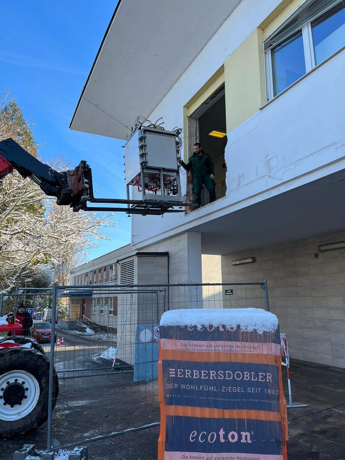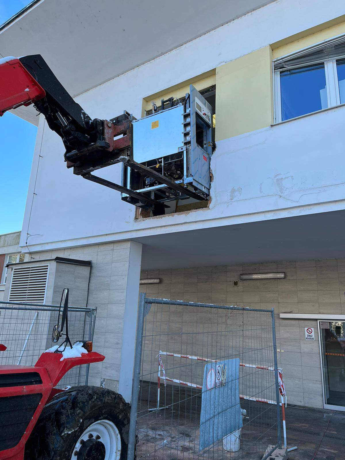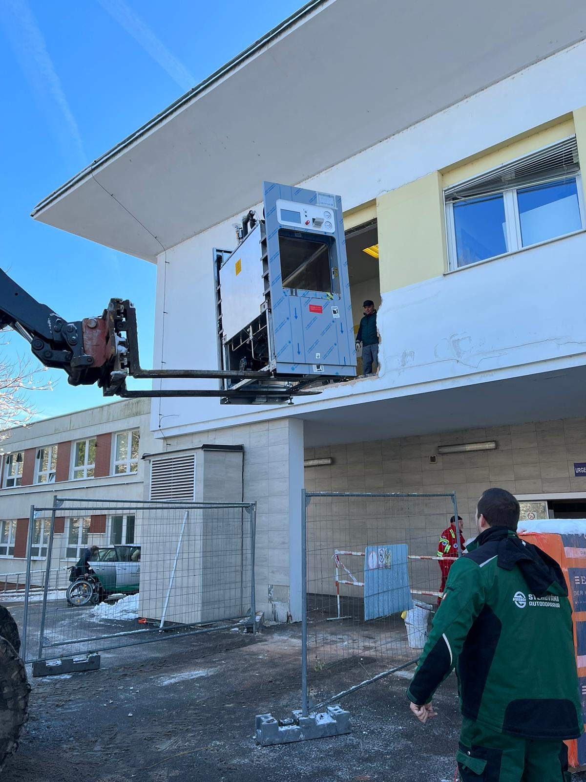 Stěhování nového sterilizátoru do nemocnice v Hodoníně za pomocí vysokozdvižné težké techniky.